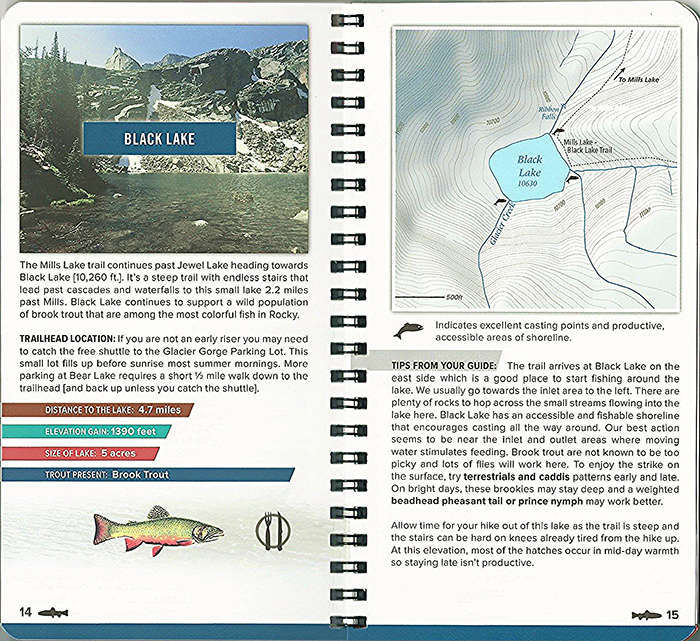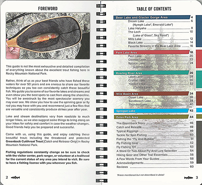 Angler’s Guide to Rocky Mountain National Park-Second Edition is filled with even more of the same valuable information found in the first edition. The authors share directions to their favorite lakes and streams in RMNP. New custom topographic maps replace the maps in the first edition. The advance in WATERPROOF printing materials results in an even more durable guide designed for rugged use in the Rocky Mountains. Additional pages cover the excellent fishing available in the Estes Park area. Clear illustrations detail the riggings, knots and flies we use to catch quality fish in RMNP and all around Colorado. Also contains interpretational information on the protected and threatened greenback cutthroat trout populations for catch and release. This Second Edition represents a big step forward for this popular guide that’s “Like Having a Professional Guide in Your Pocket”